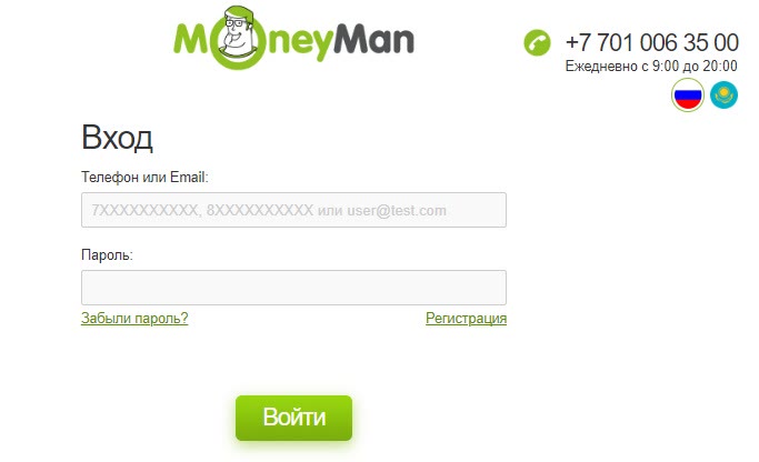 Вход в личный кабинет на сайте MoneyMan kz осуществляется по телефону или e-mail адресу и паролю. Если клиент забыл пароль, его можно восстановить. Для этого под формой входа нужно нажать ссылку “Забыли пароль?”.