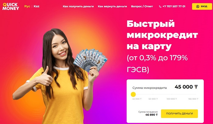 Quick Money — лицензированная МФО (лицензия №05.21.0003.М), работающая с 2015 года и предлагающая микрокредиты от 2 000 до 166 000 тенге на срок 5–20 дней со ставкой от 0,3% в день (ГЭСВ до 179%). Сервис ориентирован на срочные нужды, одобряет заявки даже с неидеальной кредитной историей и выдает деньги за 10 минут онлайн или в офисах.